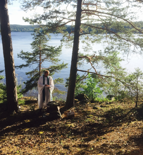 Ring lägrets präst, säkrast vid måltiderna. Vi försöker begränsa mobilanvändningen under lägret för att skapa en gemensam närvaro.